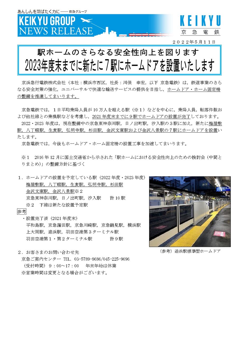 ※『京急線』新たに7駅にホームドア設置ついては、こちら。