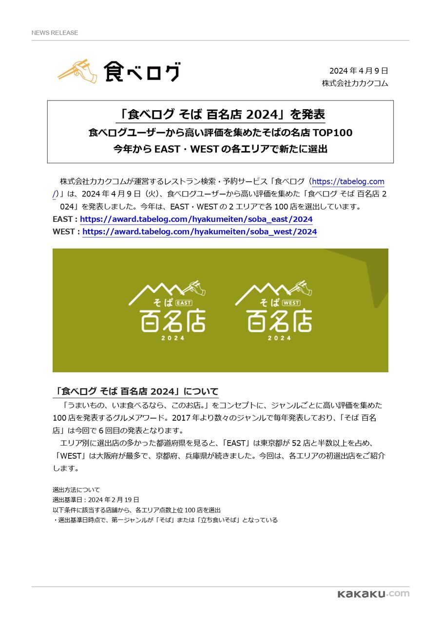 ※『食べログ そば EAST 百名店 2024』については、こちら。